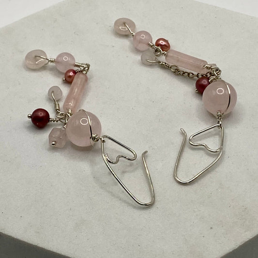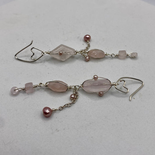 Long Rose Quartz & Pearl Dangle Earrings by Hip Chick Glass, Sterling Silver Earrings, Handmade Gemstone Jewelry, Handmade Jewelry Gift, June Birthstone Earrings