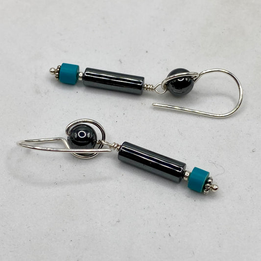 Hematite & Chalk Turquoise Dangle Earrings by Hip Chick Glass, Sterling Silver Earrings, Handmade Gemstone Jewelry, Handmade Jewelry Gift, Birthstone Earrings