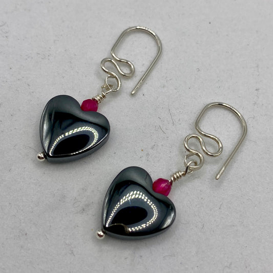 Hematite Heart Dangle Earrings by Hip Chick Glass, Sterling Silver Earrings, Handmade Gemstone Jewelry, Handmade Jewelry Gift, Birthstone Earrings