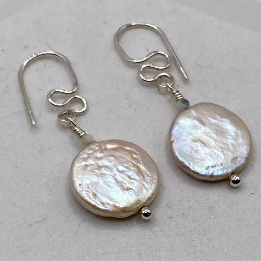 Coin Pearl Drop Earrings by Hip Chick Glass, Sterling Silver Earrings, Handmade Gemstone Jewelry, June Birthstone Gift