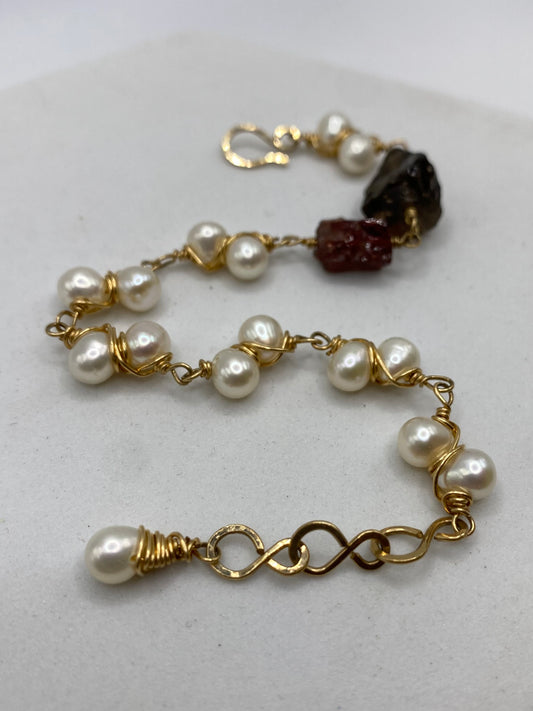 Gold Pearl, Raw Smoky Quartz & Raw Garnet Bracelet by Hip Chick Glass, Handmade Gold Fill Wire Wrap Jewelry, Handmade Gemstone Bracelet, June & January Birthstone Gift