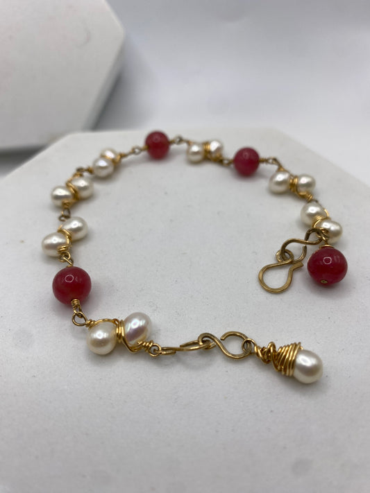Gold Pearl & Raw Ruby Bracelet by Hip Chick Glass, Handmade Gold Fill Wire Wrap Jewelry, Handmade Gemstone Bracelet, June & July Birthstone Gift