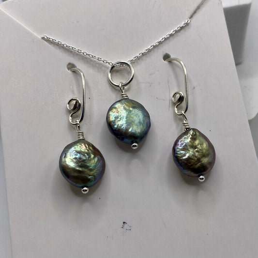 Black Coin Pearl Necklace Earring Set by Hip Chick Glass, Handmade Sterling Silver Jewelry, Handmade Gemstone Jewelry, June Birthstone Gift