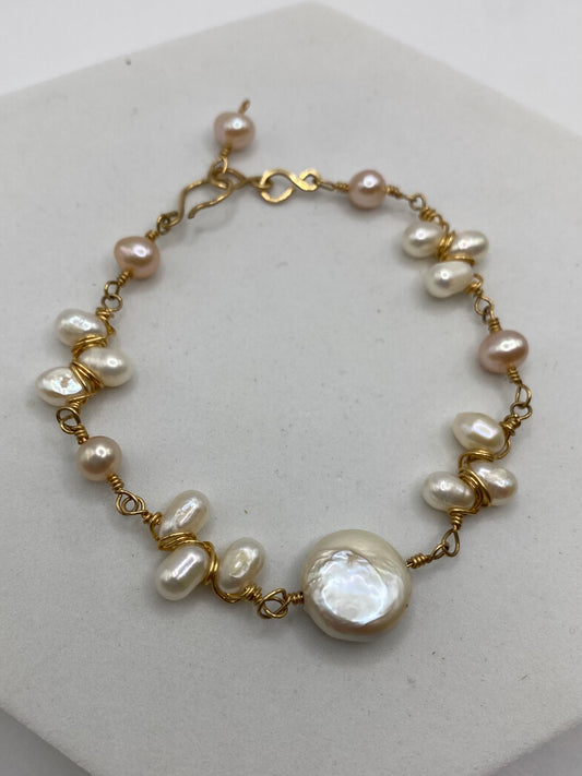 Gold Coin Pearl Bracelet by Hip Chick Glass, Handmade Gold Fill Wire Wrap Jewelry, Handmade Gemstone Bracelet, June Birthstone Gift