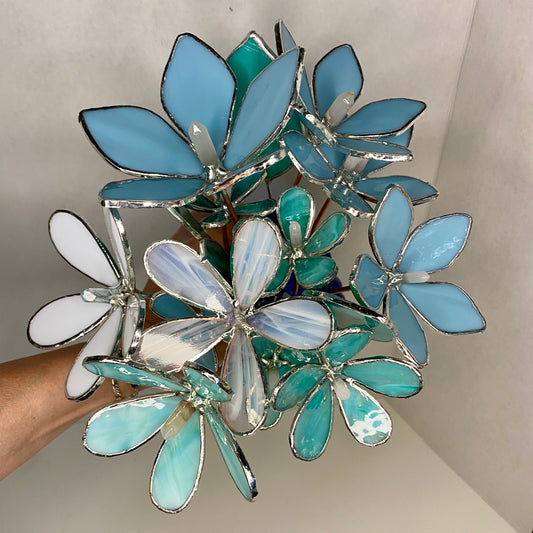 Mini Bouquet, Set of 3 Flowers & 1 Leaf | Stained Glass Flower Bouquet, Glass Flowers with Quartz Crystals on a Stem, Handmade Home Decor, Wedding Bouquet Keepsake, Tabletop Decor