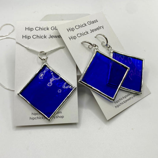 Dark Blue Diamond Stained Glass Jewelry Set by Hip Chick Glass, Stained Glass Necklace Stained Glass Earrings