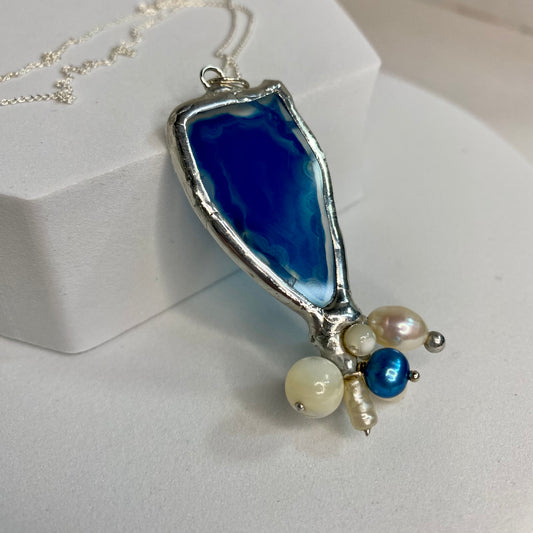 Blue Agate & Pearl Cluster Necklace | Agate Slice Necklace by Hip Chick Glass, Handmade Silver Pendant Necklace, Silver Pearl Agate Necklace, Handmade Jewelry