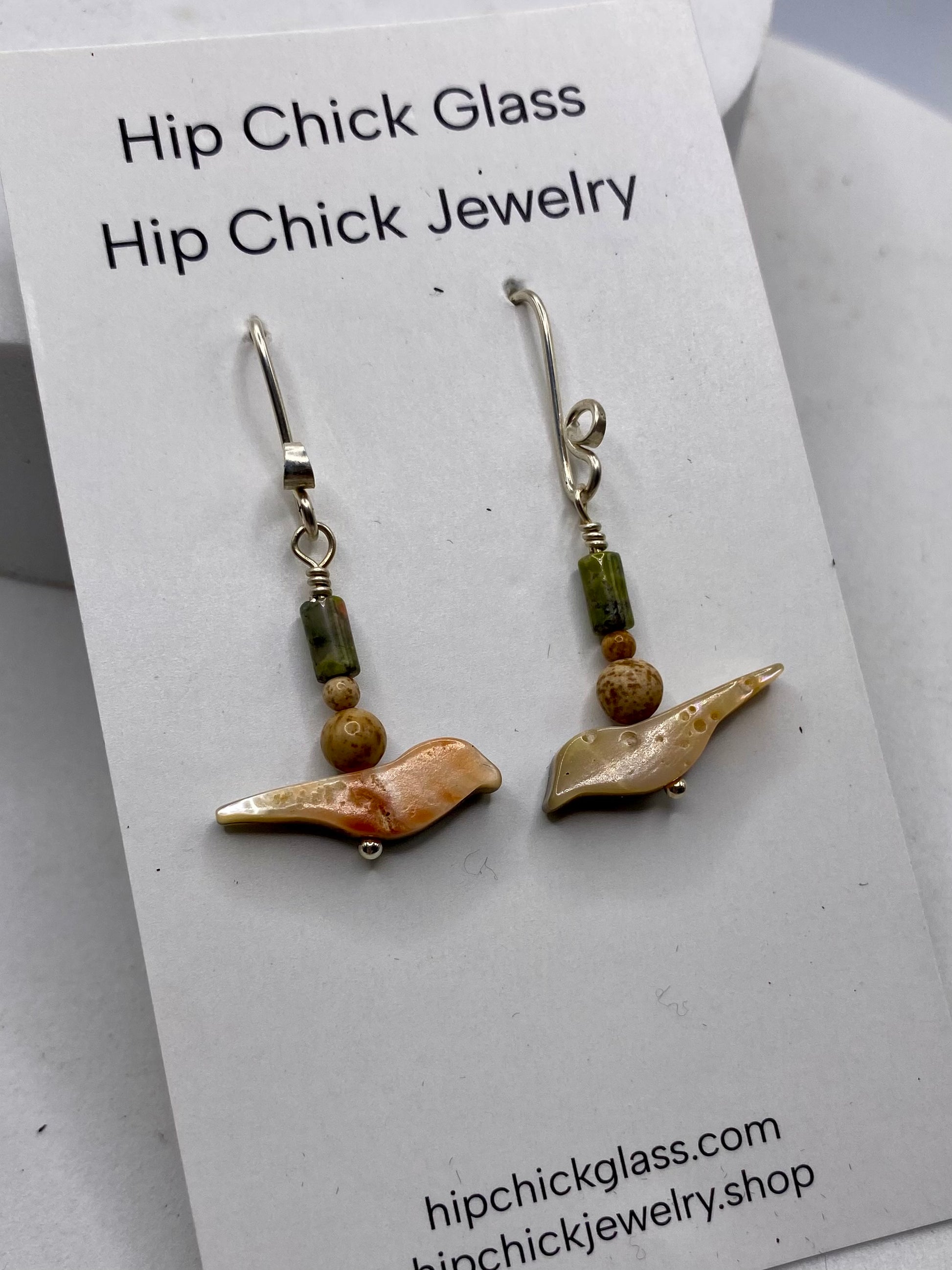 Abalone Bird, Picture Jasper, Unakite Earrings by Hip Chick Glass, Handmade Sterling Silver Earrings, Silver Gemstone Jewelry