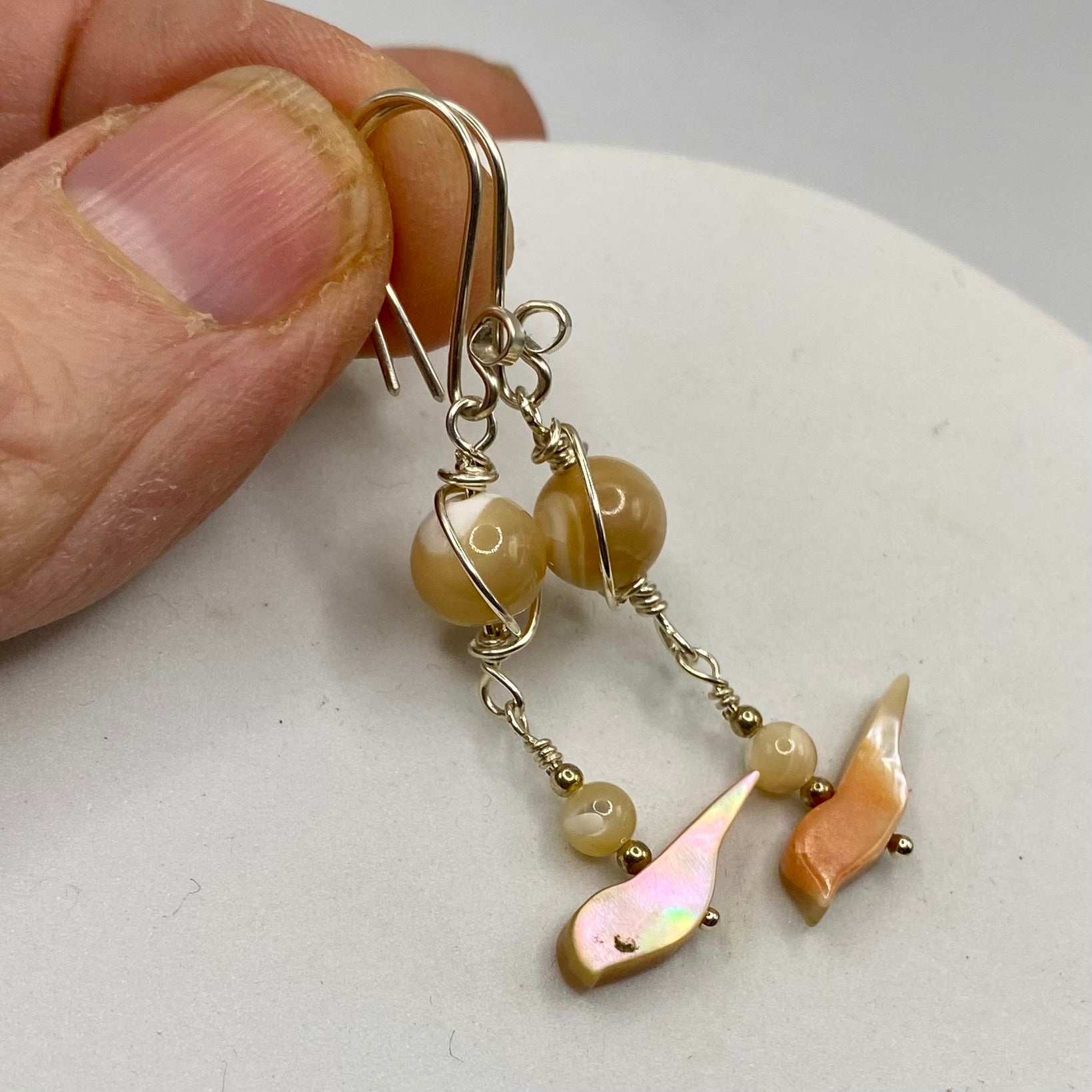 Abalone, Mother of Pearl Long Bird Earrings by Hip Chick Glass, Handmade Sterling Silver Earrings, Silver Gemstone Jewelry