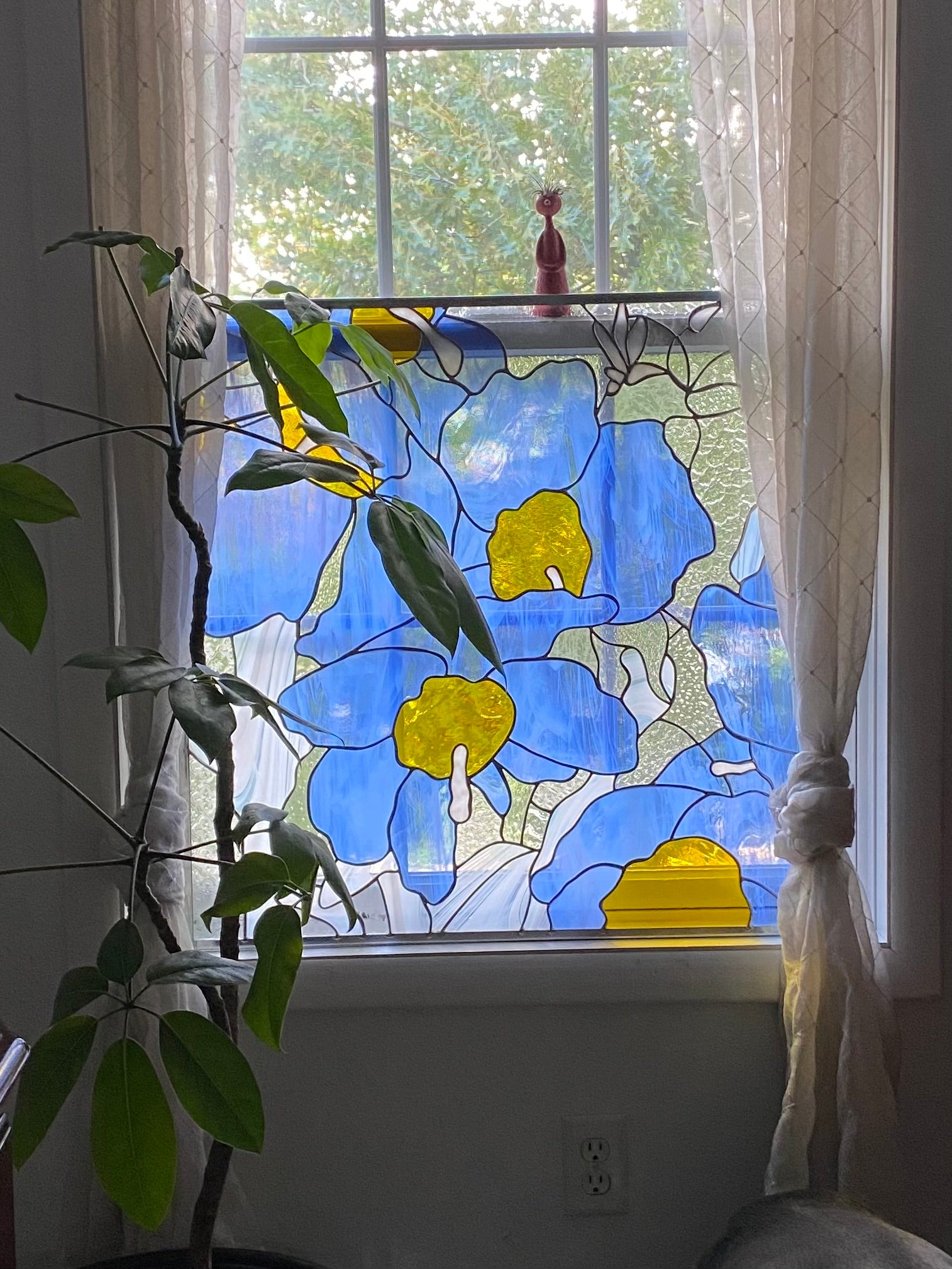 Bring a burst of color and beauty into your space with this stunning Himalayan blue poppies stained glass window panel. Handmade by Hip Chick Glass, LLC, this unique piece adds a touch of original art to any room. Elevate your decor with the intricate design and vibrant hues of this exquisite glass panel.