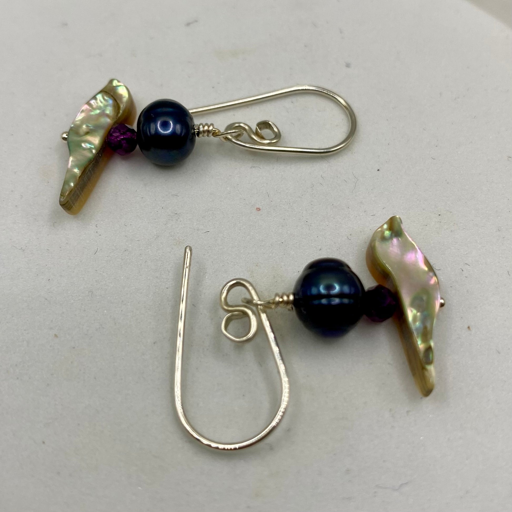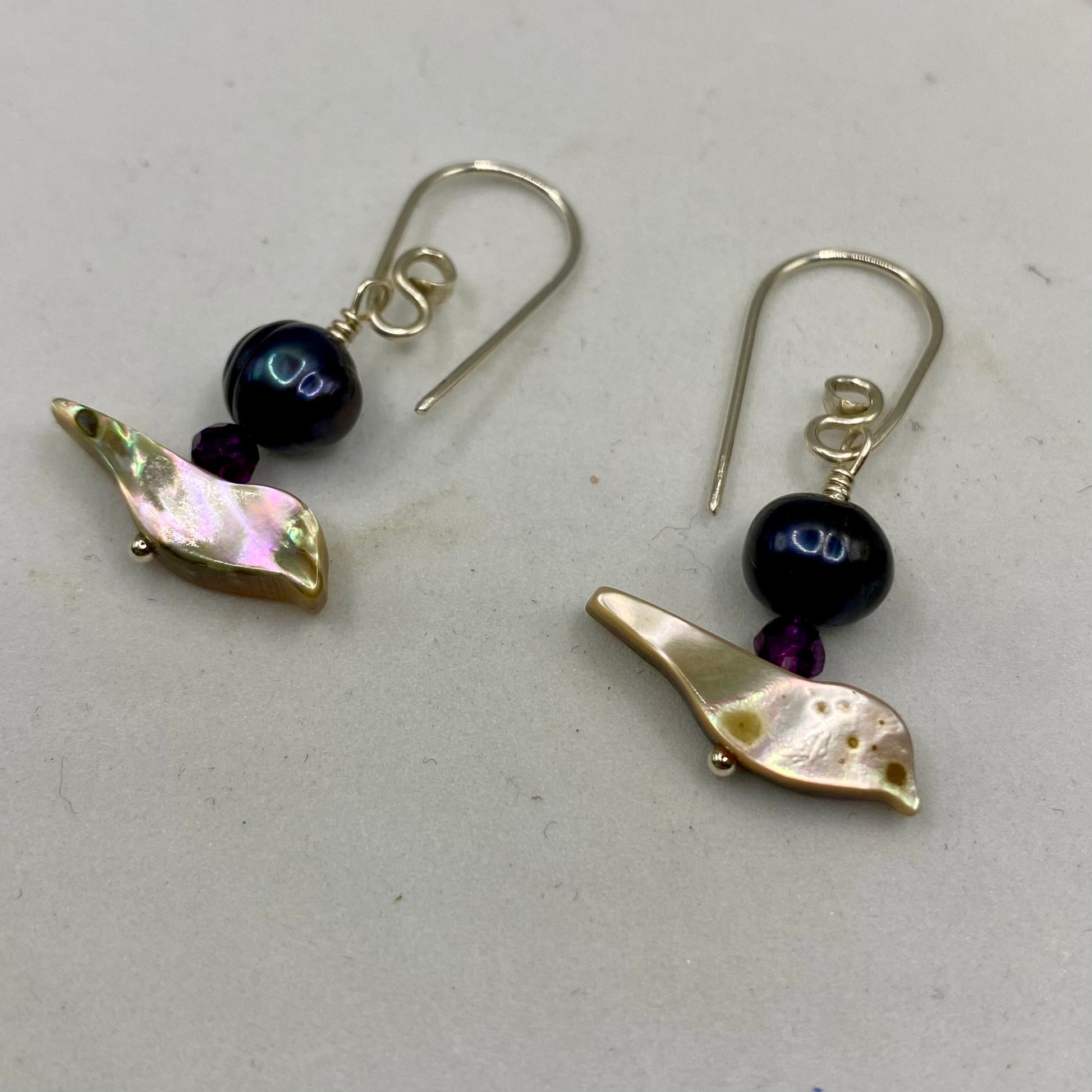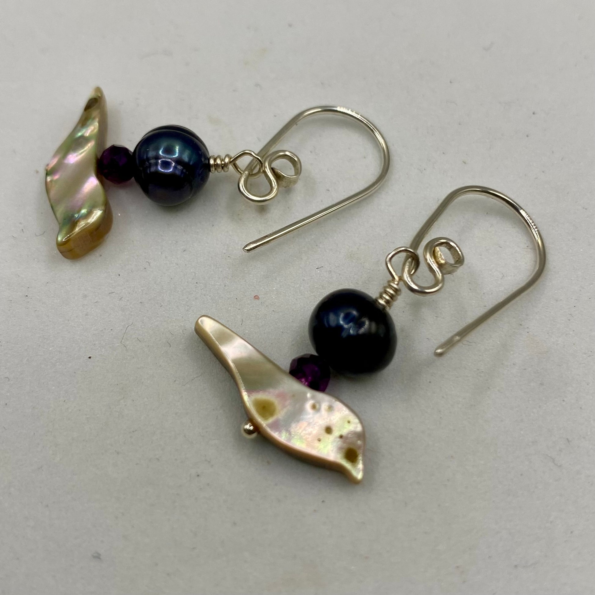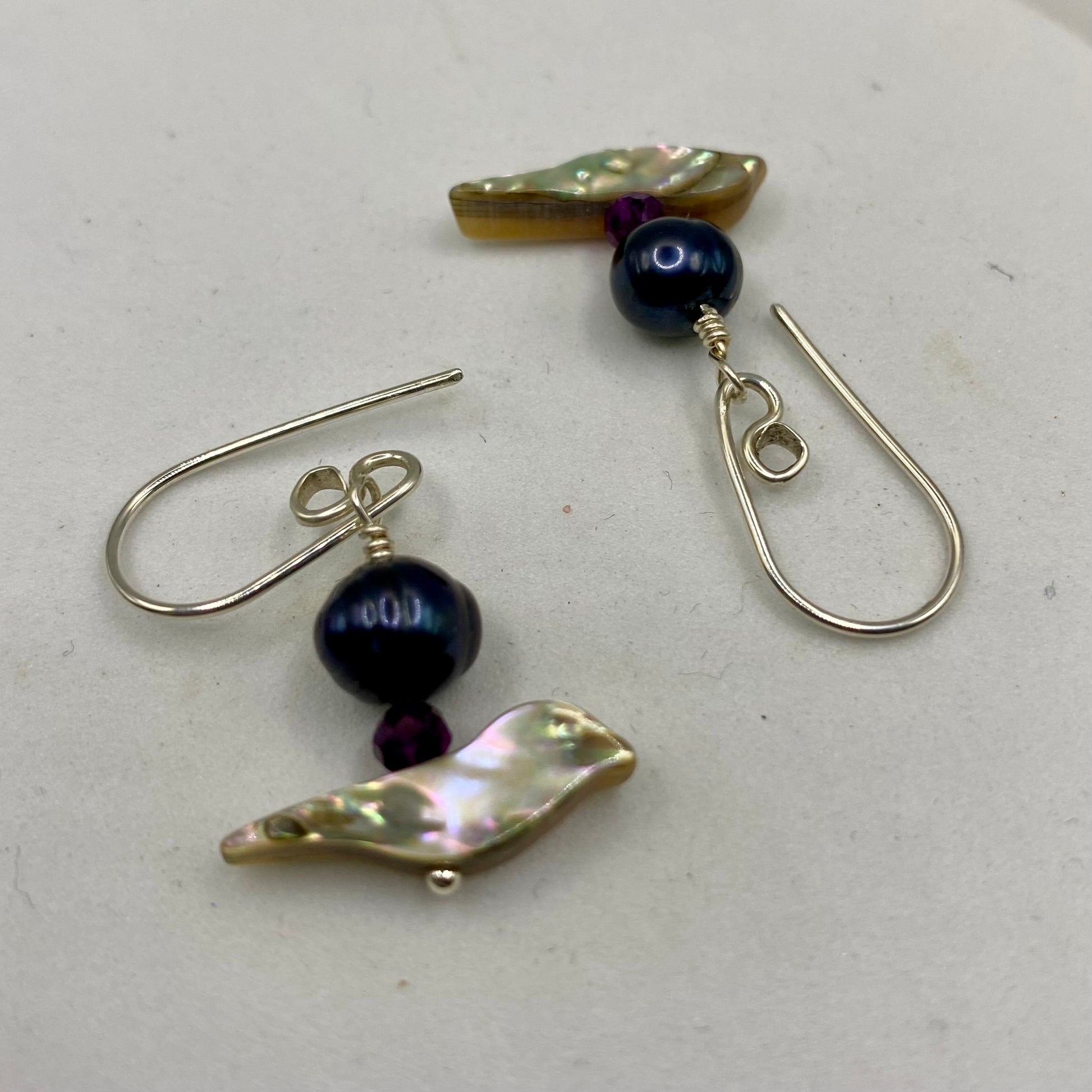Bird Abalone, Iolite & Pearl Earrings by Hip Chick Glass, Handmade Sterling Silver Earrings, Silver Gemstone Jewelry