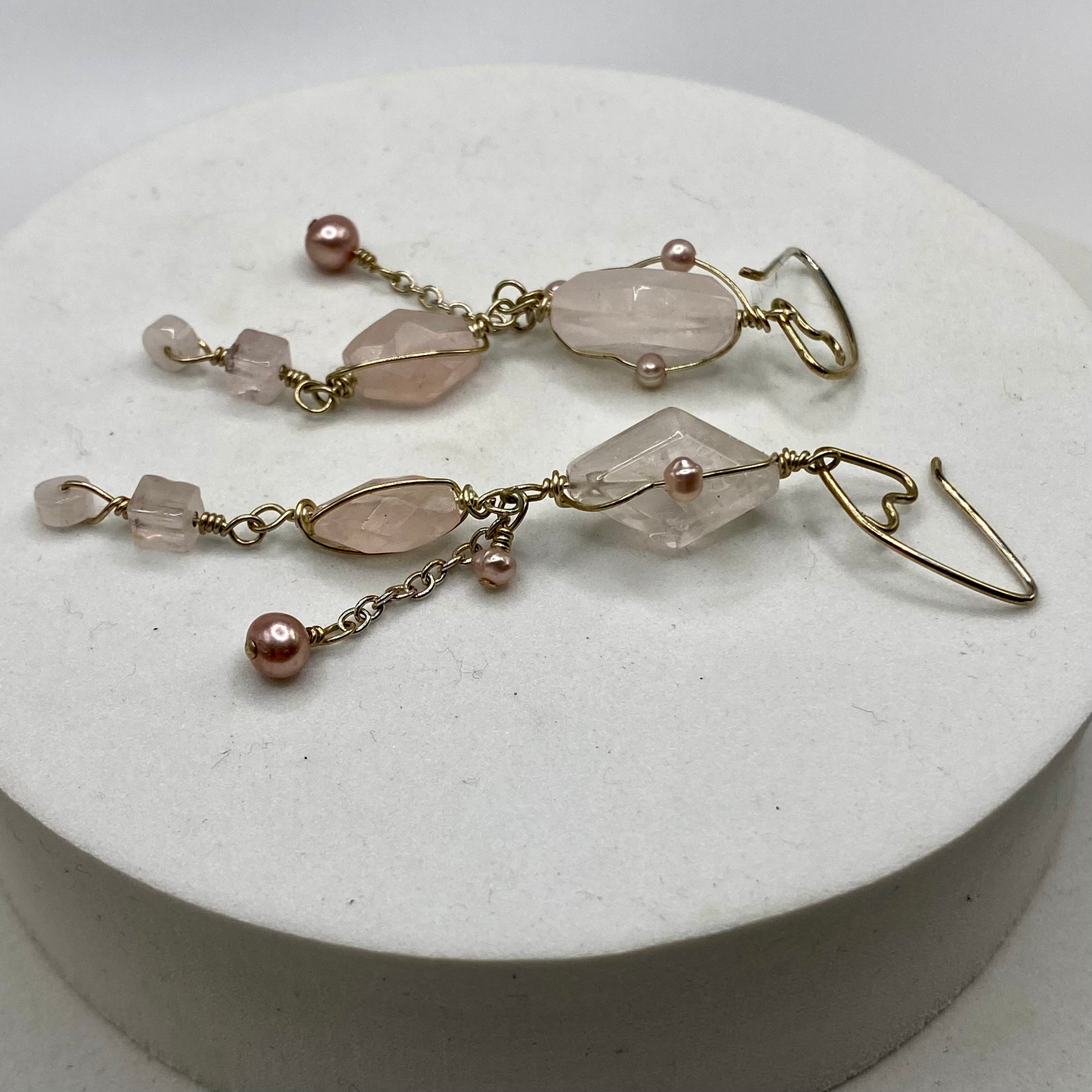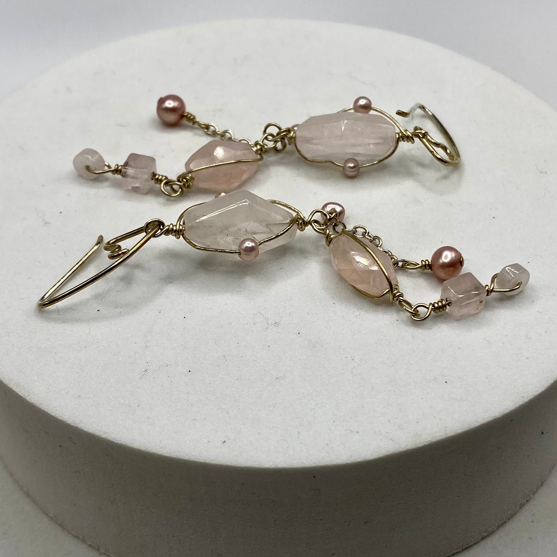 Long Rose Quartz Earrings with Pearl Wrap by Hip Chick Glass, Boho Luxe Gemstone Earrings, Handmade Rose Quartz Earrings, June Birthstone Gift