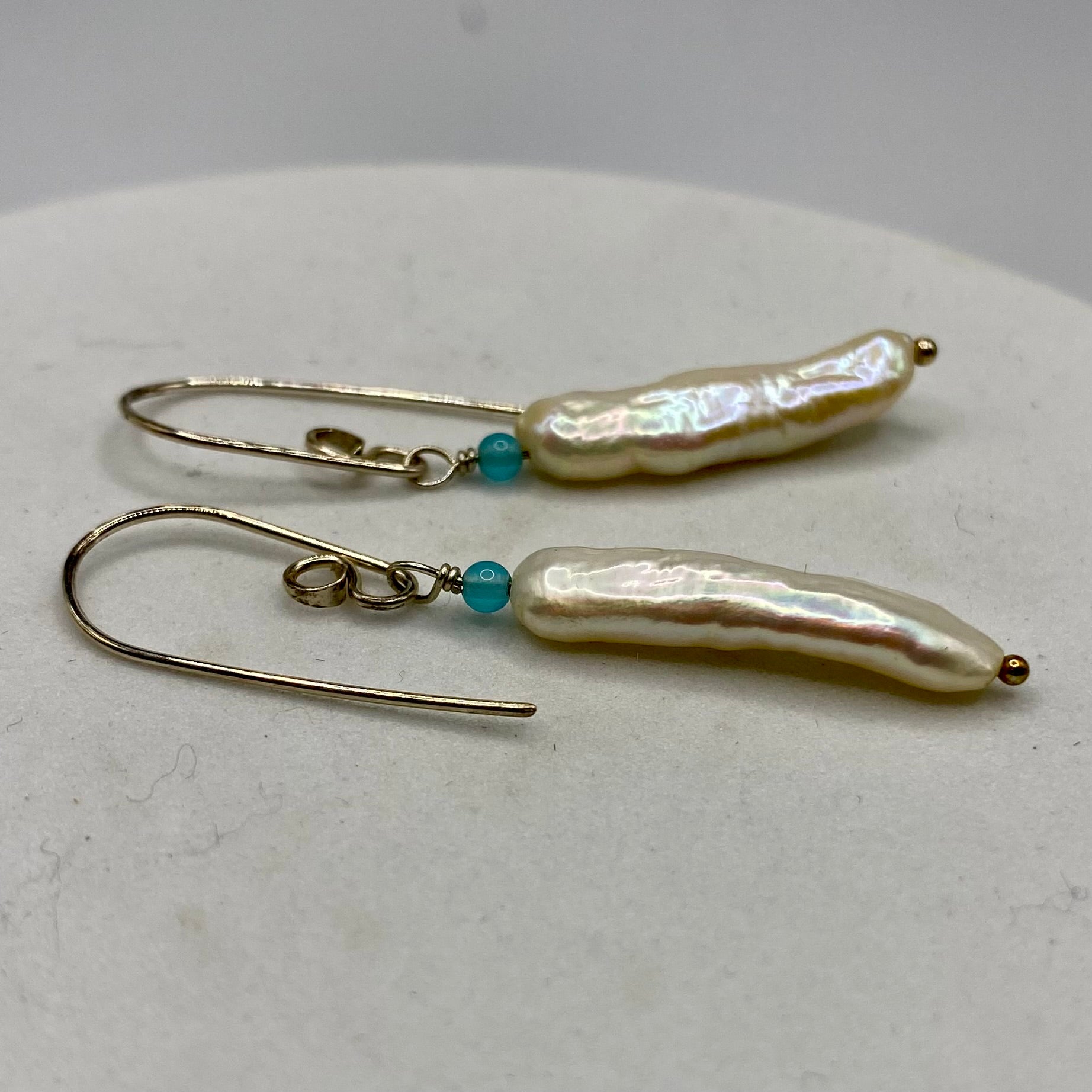 Stick Pearl & Aquamarine Dangle Earrings by Hip Chick Glass, Sterling Silver Drop Earrings, Handmade Gemstone Earrings, June Birthstone Gift, March Birthstone Gift