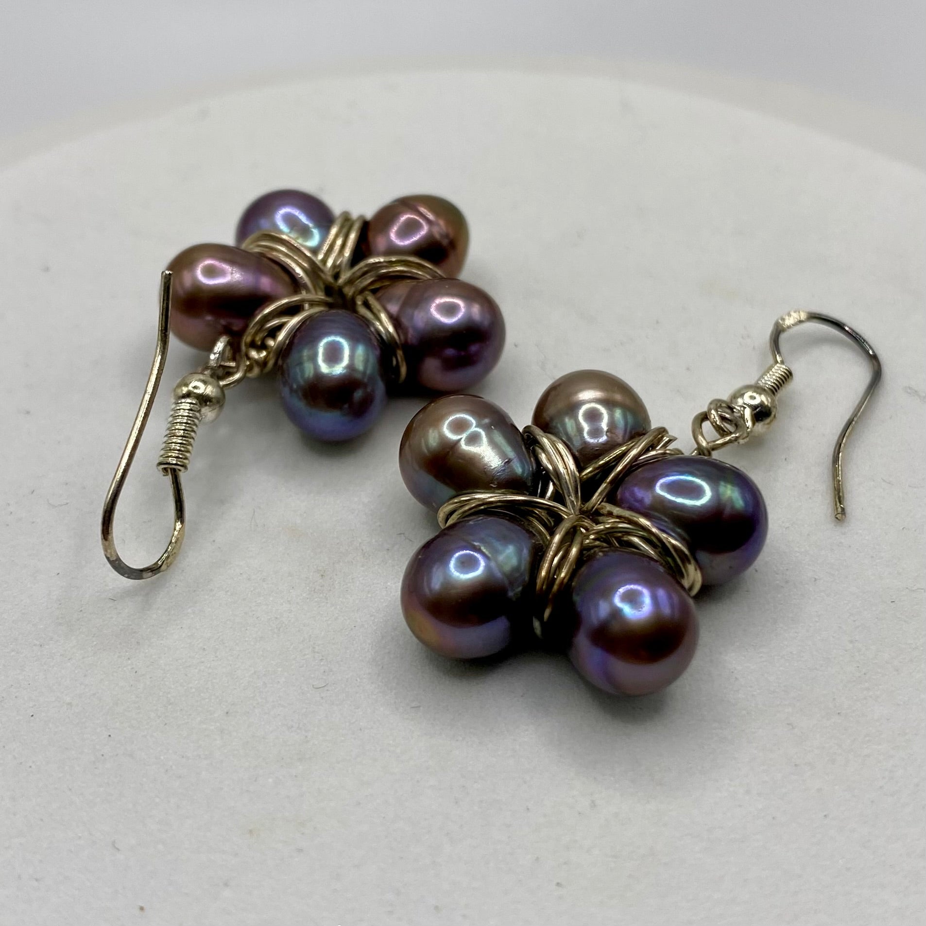 Black Pearl Flower Earrings by Hip Chick Glass, Sterling Silver Wire Wrap Earrings, Handmade Gemstone Jewelry, June Birthstone Gift