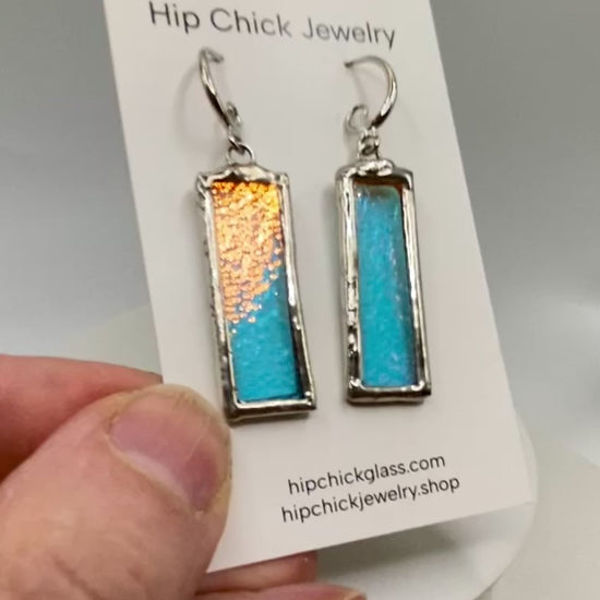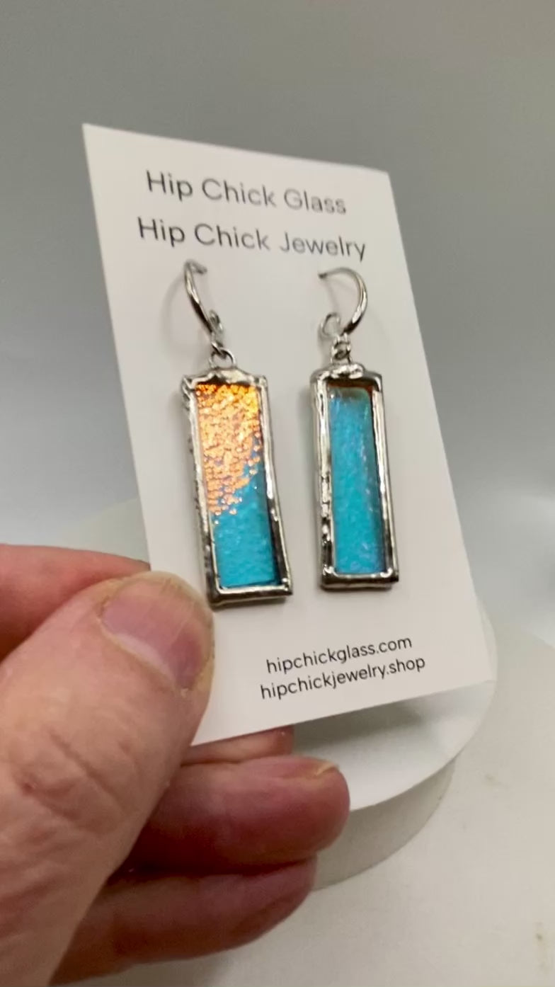 Turquoise Blue Rectangle Earrings | Stained Glass Earrings by Hip Chick Glass, Iridescent Statement Earrings, Geometric Earrings