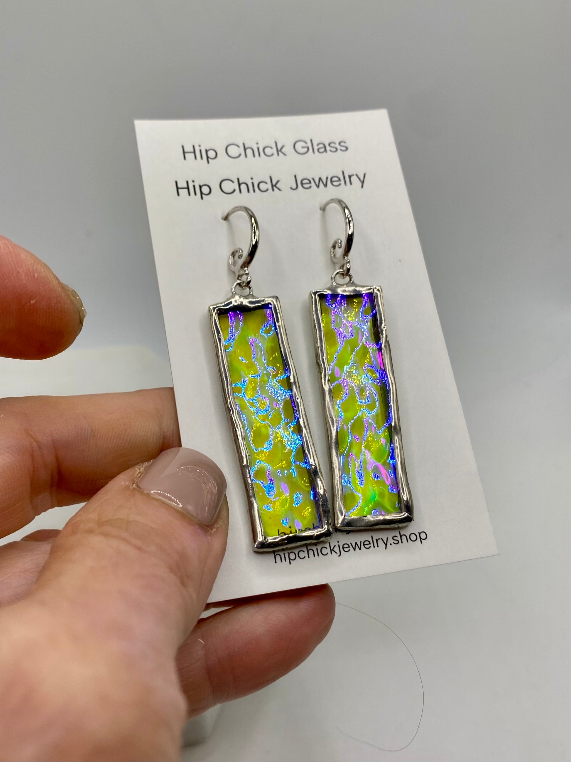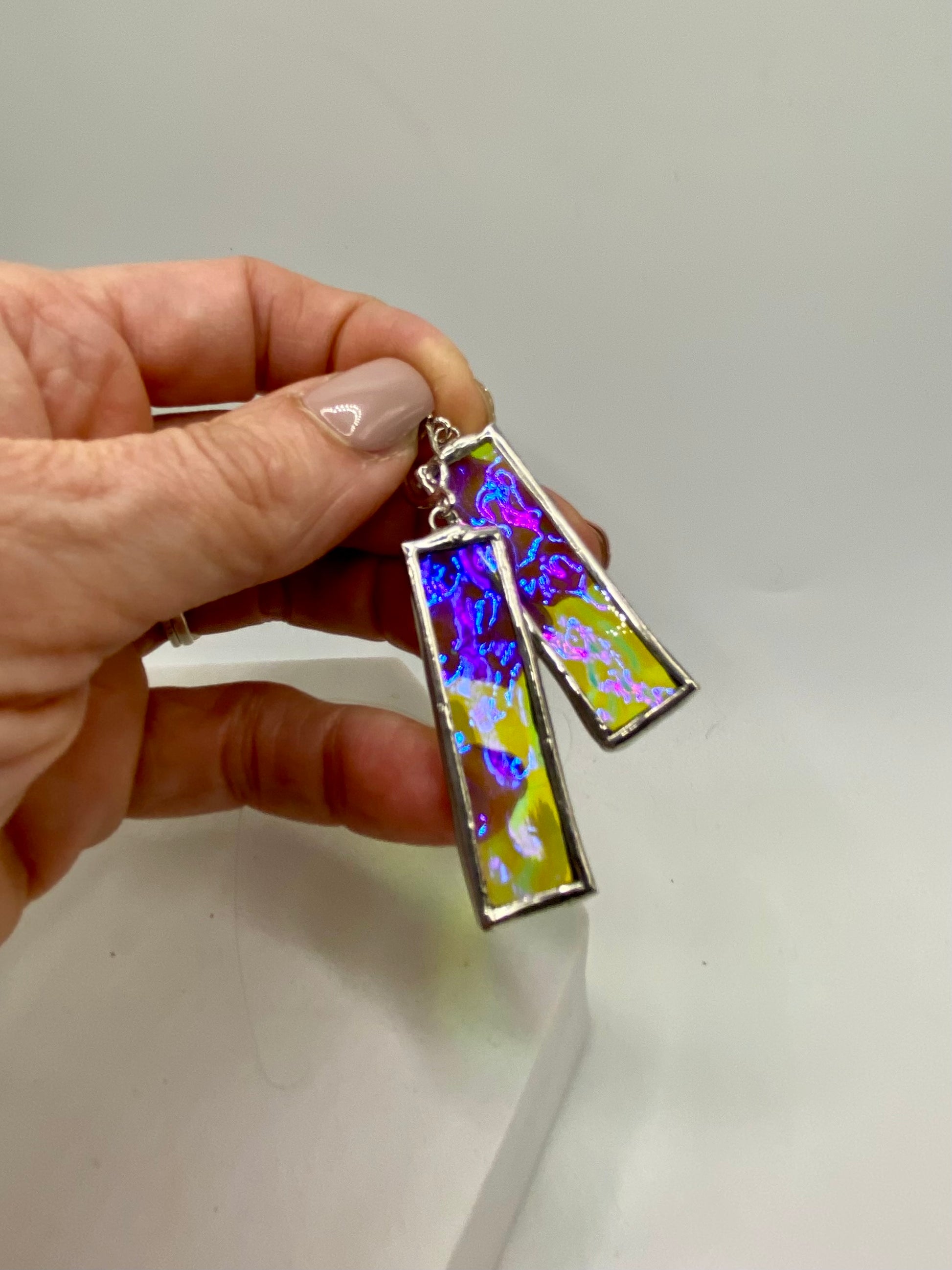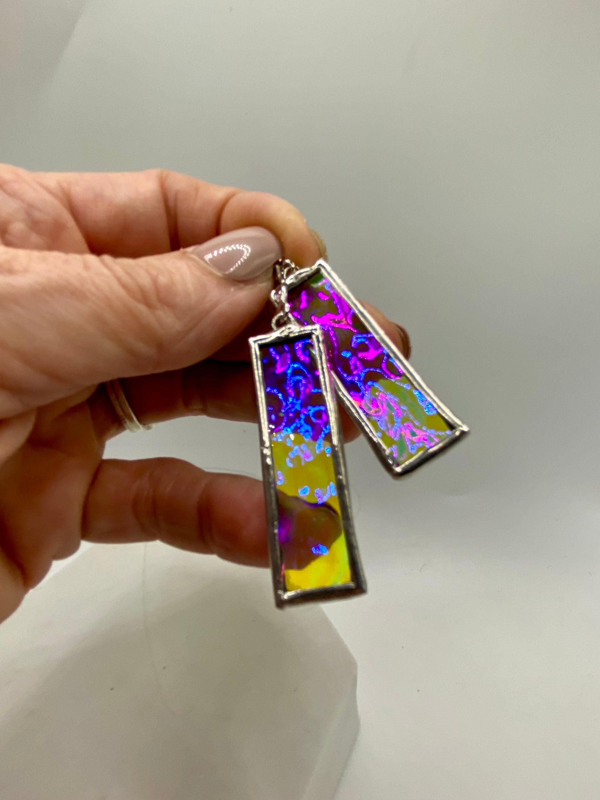 #hipchickglass #hipchick #stainedglass #glassart #glassartist #stainedglasswindow #suncatcher #stainedglasswindowpanel #glass #glassearrings #stainedglassearrings #stainedglassjewelry #dichroicglass #dichroicglassearrings #jewelry #dichroicglassjewelry #earrings #handmadejewelry #handmadedangledropearrings #statementearrings #geometricearrings