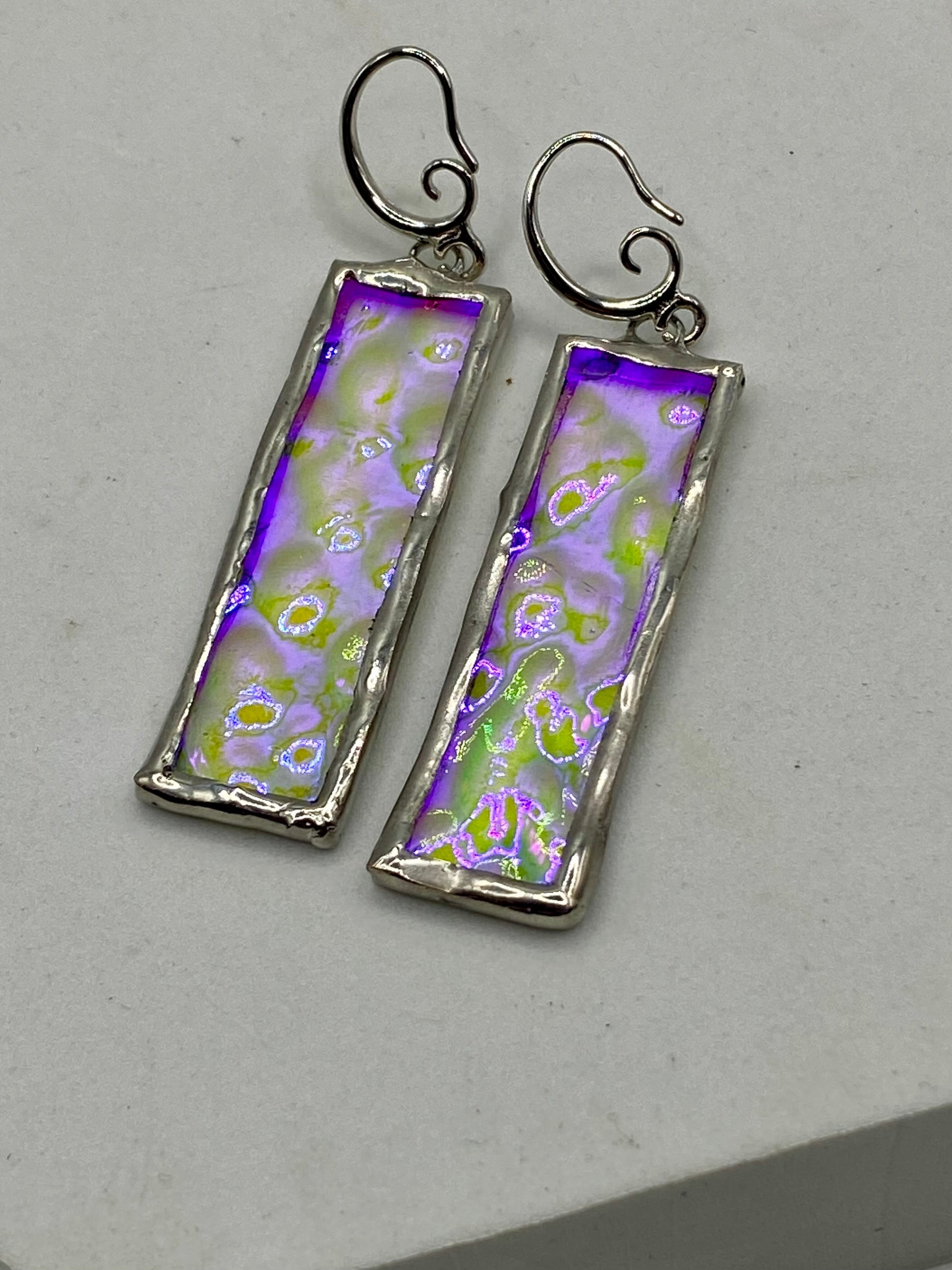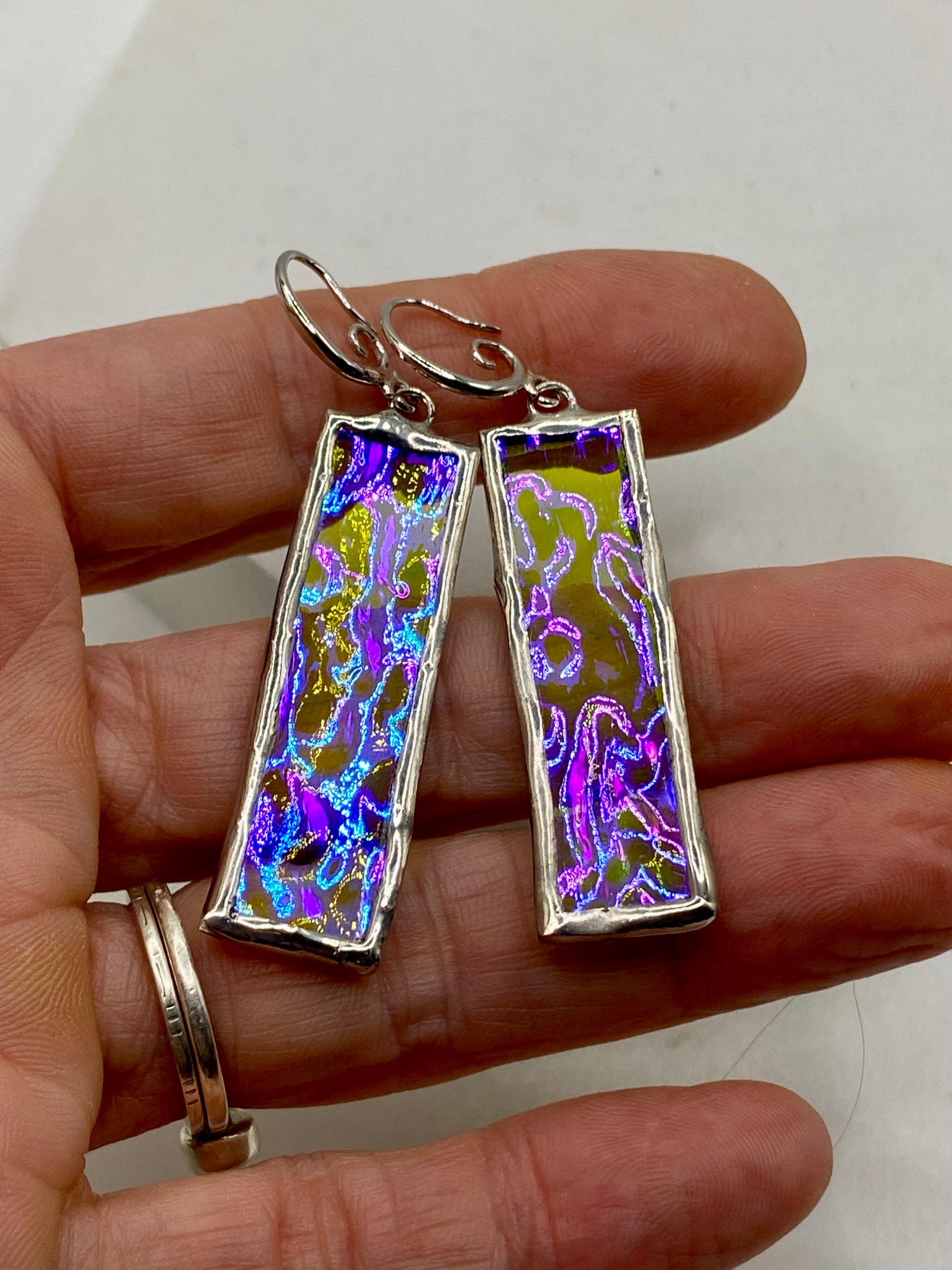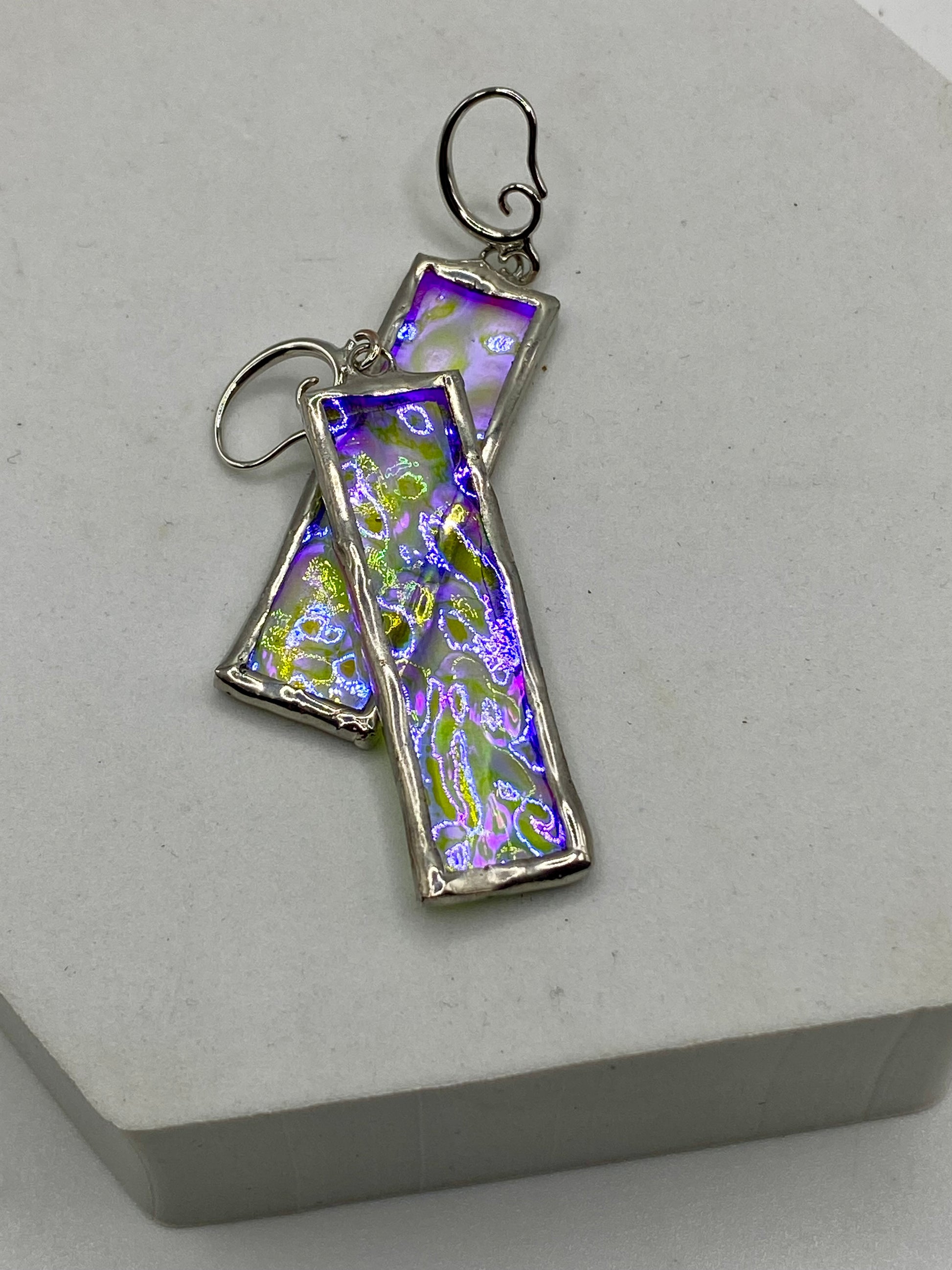 #hipchickglass #hipchick #stainedglass #glassart #glassartist #stainedglasswindow #suncatcher #stainedglasswindowpanel #glass #glassearrings #stainedglassearrings #stainedglassjewelry #dichroicglass #dichroicglassearrings #jewelry #dichroicglassjewelry #earrings #handmadejewelry #handmadedangledropearrings #statementearrings #geometricearrings