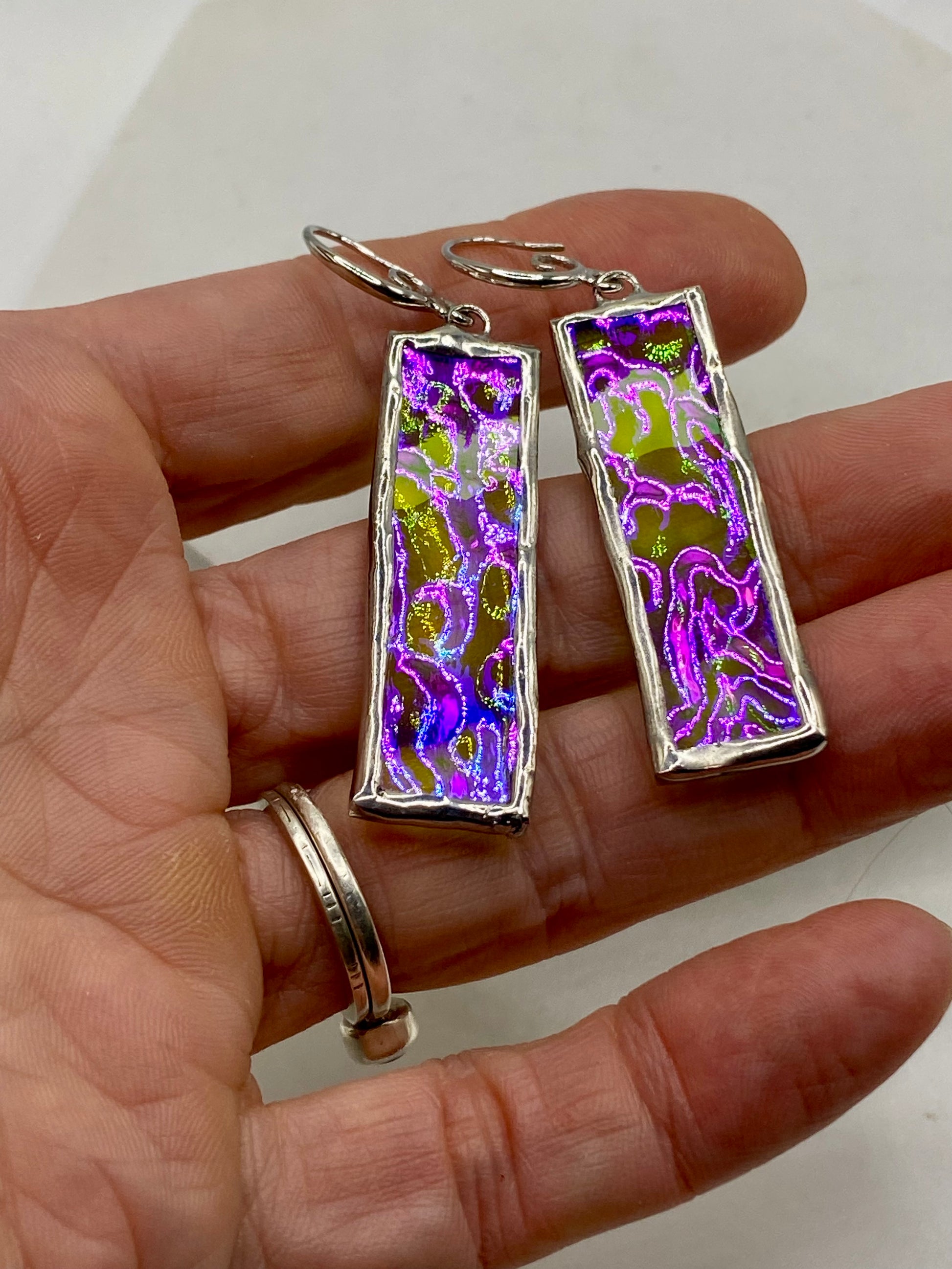 Purple & Clear Wavy Rectangle Earrings | Stained Glass Earrings by Hip Chick Glass, Iridescent Statement Earrings, Geometric Earrings