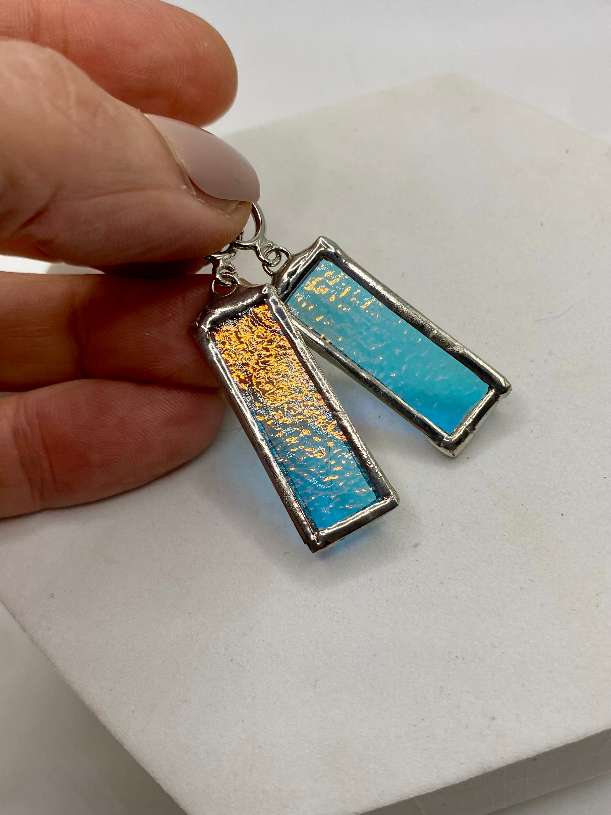Blue & Yellow Rectangle Earrings | Stained Glass Earrings by Hip Chick Glass, Iridescent Statement Earrings, Geometric Earrings